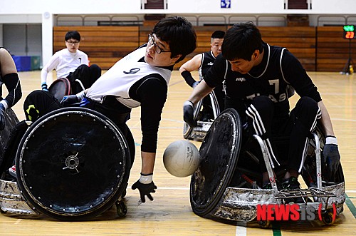 【서울=뉴시스】전신 기자 = 28일 오후 서울 관악구 서울대학교 체육관에서 열린 서울컵 제5회 전국휠체어럭비 선수권대회에서 쿼드 결승전 경북 아틀라스Q와 서울 헌터스의 경기에서 아틀라스Q 정종혁과 헌터스 이장규가 볼을 다투고 있다.