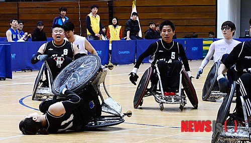 【서울=뉴시스】전신 기자 = 28일 오후 서울 관악구 서울대학교 체육관에서 열린 서울컵 제5회 전국휠체어럭비 선수권대회에서 쿼드 결승전 경북 아틀라스Q와 서울 헌터스의 경기에서 아틀라스Q 김소영이 패스 도중 넘어지고 있다.
