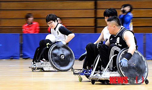【서울=뉴시스】전신 기자 = 28일 오후 서울 관악구 서울대학교 체육관에서 열린 서울컵 제5회 전국휠체어럭비 선수권대회에서 쿼드 결승전 경북 아틀라스Q와 서울 헌터스의 경기에서 헌터스 이장규가 돌파를 시도하고 있다.