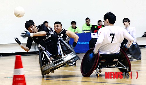 【서울=뉴시스】전신 기자 = 28일 오후 서울 관악구 서울대학교 체육관에서 열린 서울컵 제5회 전국휠체어럭비 선수권대회에서 쿼드 결승전 경북 아틀라스Q와 서울 헌터스의 경기에서 아틀라스Q 정종혁이 공을 받으며 넘어지고 있다.