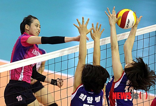 【아산=뉴시스】8일 충남 아산시 아산고체육관에서 열린 제68회 전국남녀종별배구선수권대회 여고부 준결승 세화여고 vs 강릉여고 경기에서 세화여고 공윤희의 공격을 강릉여고 전하늘과 최한별이 블로킹 하고 있다. (사진=발리볼코리아닷컴 제공)