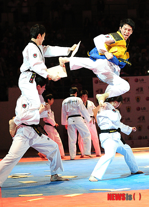 【암만(요르단)=뉴시스】채정병 기자 = LG배 요르단 태권도대회가 17일과 18일 열린 가운데 국기원 태권도 시범단이 17일(현지시간) 암만 스포츠시티 프린스 함자홀에서 화려한 태권도 시범공연을 펼치며 요르단 관중들로부터 뜨거운 호응을 받았다. 특히 고난도의 격파 기술이 나올 때마다 관중들은 환호성을 지르며 태권도의 매력에 빠져들었다.