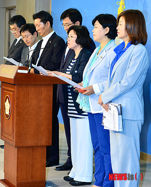 【서울=뉴시스】김기태 기자 = 11일 오후 서울 여의도 국회 정론관에서 민주당 '국정원 선거개입 진상조사특별위원회(위원장 신경민)' 소속 의원들이 기자회견을 열고 황교안 법무부장관과 곽상도 민정수석의 즉각 사퇴를 촉구하고 있다. 2013.06.11.