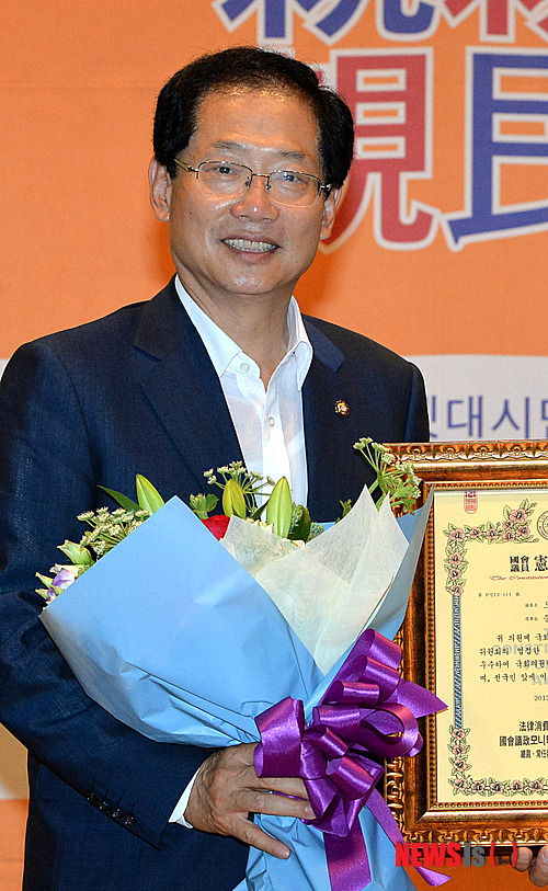 【서울=뉴시스】권주훈 기자 = 270여 시민,사회단체가 함께하는우리 법률소비자연맹 총본부 국정감사 NGO 모니터단 주관단체는 19대 국회 1차년도 의정활동 평가회를 갖고 18일 오후 서울 여의도 국회 헌정기념관에서 국회의원 의장활동 종합평가 및 헌정대상 시상식에서 3선의원인 민주당 오제세 의원이 헌정대상을 수상 하고 있다. 2013.06.18.