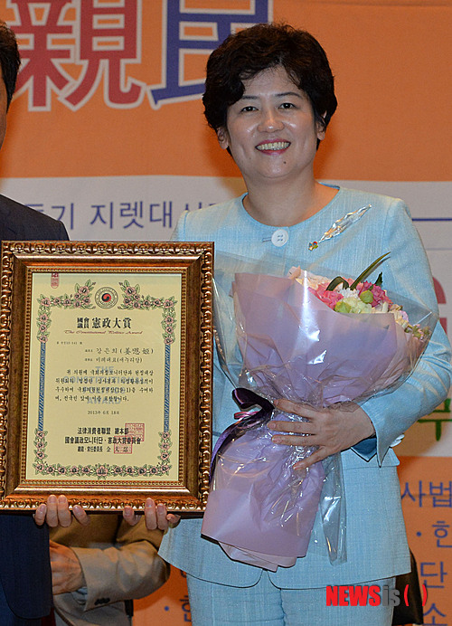 【서울=뉴시스】권주훈 기자 = 18일 오후 국회의원 의정활동 종합평가회 및 국회의원 헌정대상 시상식이 열린 서울 여의도 국회 헌정기념관 대강당에서 새누리당 강은희 의원(초선)이 헌정대상 상패를 받고 있다.