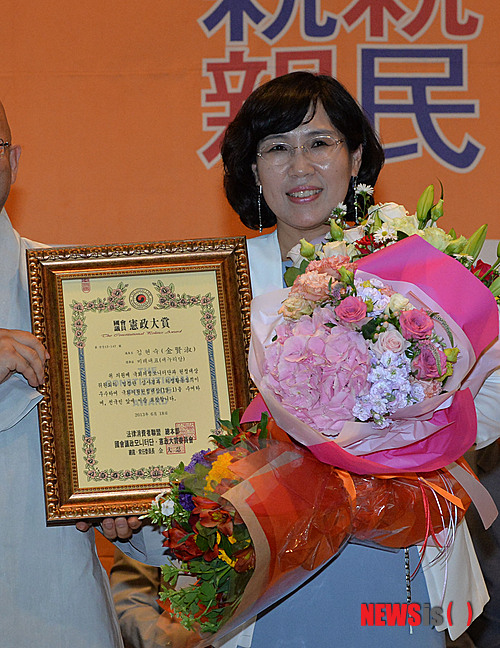 【서울=뉴시스】권주훈 기자 = 18일 오후 국회의원 의정활동 종합평가회 및 국회의원 헌정대상 시상식이 열린 서울 여의도 국회 헌정기념관 대강당에서 새누리당 김현숙 의원(초선)이 헌정대상 상패를 받고 있다.