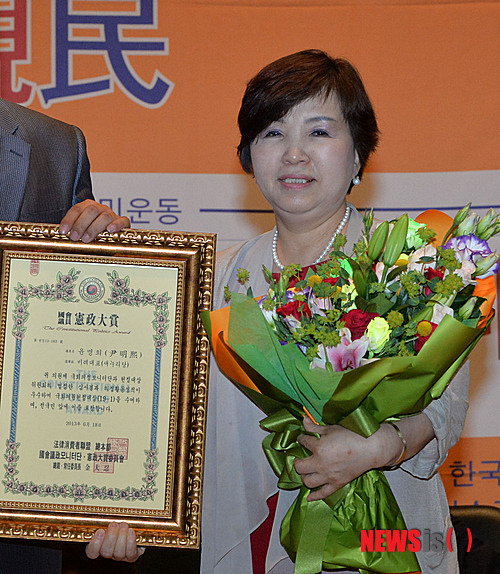 【서울=뉴시스】권주훈 기자 = 18일 오후 국회의원 의정활동 종합평가회 및 국회의원 헌정대상 시상식이 열린 서울 여의도 국회 헌정기념관 대강당에서 새누리당 윤명희 의원(초선)이 헌정대상 상패를 받고 있다.
