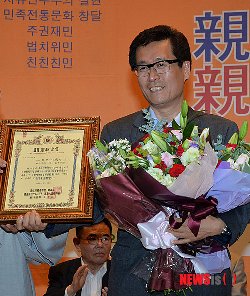 【서울=뉴시스】권주훈 기자 = 18일 오후 국회의원 의정활동 종합평가회 및 국회의원 헌정대상 시상식이 열린 서울 여의도 국회 헌정기념관 대강당에서 새누리당 함진규 초선의원이 헌정대상 상패를 받고 있다.