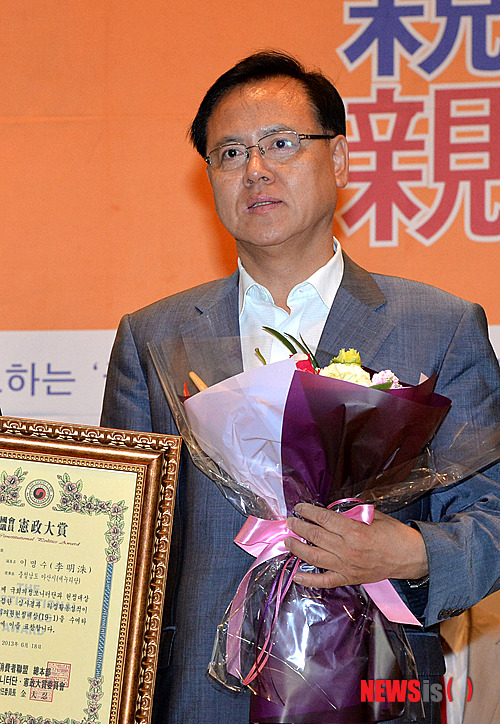 【서울=뉴시스】권주훈 기자 = 270여 시민,사회단체가 함께하는우리 법률소비자연맹 총본부 국정감사 NGO 모니터단 주관단체는 19대 국회 1차년도 의정활동 평가회를 갖고 18일 오후 서울 여의도 국회 헌정기념관에서 국회의원 의장활동 종합평가 및 헌정대상 시상식에서 재선의원인 새누리당 이명수 의원이 헌정대상을 수상 하고 있다. 2013.06.18.