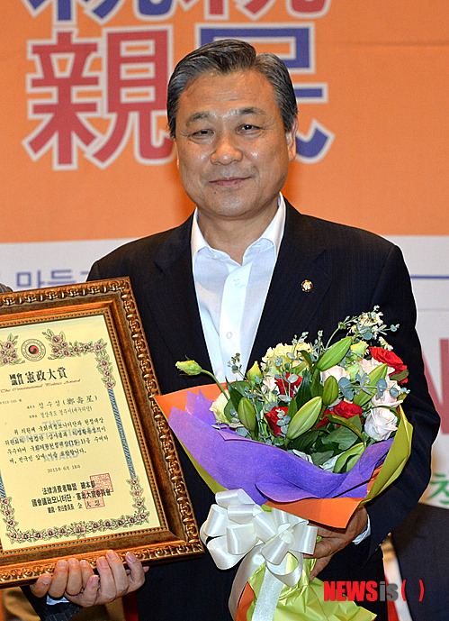 【서울=뉴시스】권주훈 기자 = 270여 시민,사회단체가 함께하는우리 법률소비자연맹 총본부 국정감사 NGO 모니터단 주관단체는 19대 국회 1차년도 의정활동 평가회를 갖고 18일 오후 서울 여의도 국회 헌정기념관에서 국회의원 의장활동 종합평가 및 헌정대상 시상식에서 재선의원인 새누리당 정수성 의원이 헌정대상을 수상 하고 있다. 2013.06.18.