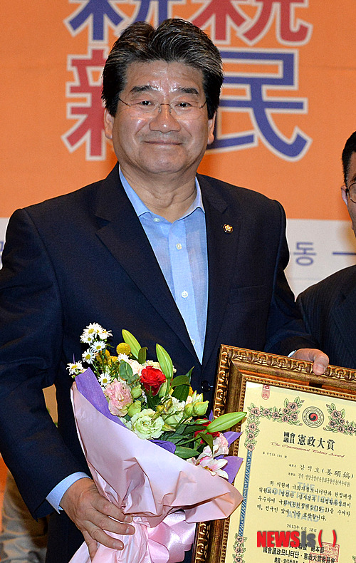 【서울=뉴시스】권주훈 기자 = 270여 시민,사회단체가 함께하는우리 법률소비자연맹 총본부 국정감사 NGO 모니터단 주관단체는 19대 국회 1차년도 의정활동 평가회를 갖고 18일 오후 서울 여의도 국회 헌정기념관에서 국회의원 의장활동 종합평가 및 헌정대상 시상식에서 재선의원인 새누리당 강석호 의원이 헌정대상을 수상 하고 있다. 2013.06.18.