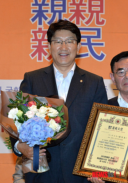 【서울=뉴시스】권주훈 기자 = 270여 시민,사회단체가 함께하는우리 법률소비자연맹 총본부 국정감사 NGO 모니터단 주관단체는 19대 국회 1차년도 의정활동 평가회를 갖고 18일 오후 서울 여의도 국회 헌정기념관에서 국회의원 의장활동 종합평가 및 헌정대상 시상식에서 재선의원인 새누리당 권성동 의원이 헌정대상을 수상 하고 있다. 2013.06.18.