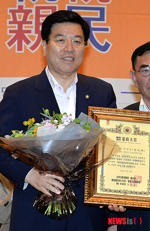 【서울=뉴시스】권주훈 기자 = 270여 시민,사회단체가 함께하는우리 법률소비자연맹 총본부 국정감사 NGO 모니터단 주관단체는 19대 국회 1차년도 의정활동 평가회를 갖고 18일 오후 서울 여의도 국회 헌정기념관에서 국회의원 의장활동 종합평가 및 헌정대상 시상식에서 재선의원인 새누리당 김광림 의원이 헌정대상을 수상 하고 있다. 2013.06.18.
