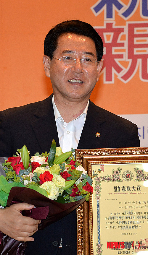 【서울=뉴시스】권주훈 기자 = 270여 시민,사회단체가 함께하는우리 법률소비자연맹 총본부 국정감사 NGO 모니터단 주관단체는 19대 국회 1차년도 의정활동 평가회를 갖고 18일 오후 서울 여의도 국회 헌정기념관에서 국회의원 의장활동 종합평가 및 헌정대상 시상식에서 재선의원인 민주당 김영록 의원이 헌정대상을 수상 하고 있다. 2013.06.18.