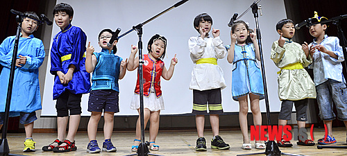 【서울=뉴시스】최동준 기자 = 30일 오후 서울 성동청소년수련관 무지개극장에서 열린 '성동외국인근로자센터' 발표회에서 몽골 어린이들로 구성된 에리카 팀이 몽골 전통 노래를 부르고 있다. 2013.06.30.