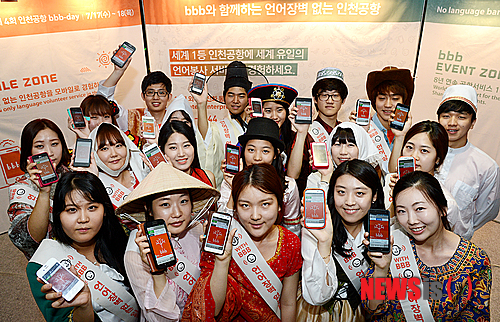 【인천=뉴시스】이종철 기자 = 언어·문화 NGO BBB 코리아(회장 유장희)는 인천국제공항과 함께 17일 공항 1층 입국장 밀레니엄 홀에서 언어장벽 없는 인천공항을 만들기 위해 ‘제4회 인천공항-BBB day' 캠페인을 진행하면서 행사의 일환으로 19개국 전통의상을 입은 봉사자들이 캠페인 어깨띠를 두르고 자신의 스마트폰으로 BBB 통역 애플리케이션을 소개하고 있다. 2013.07.17
