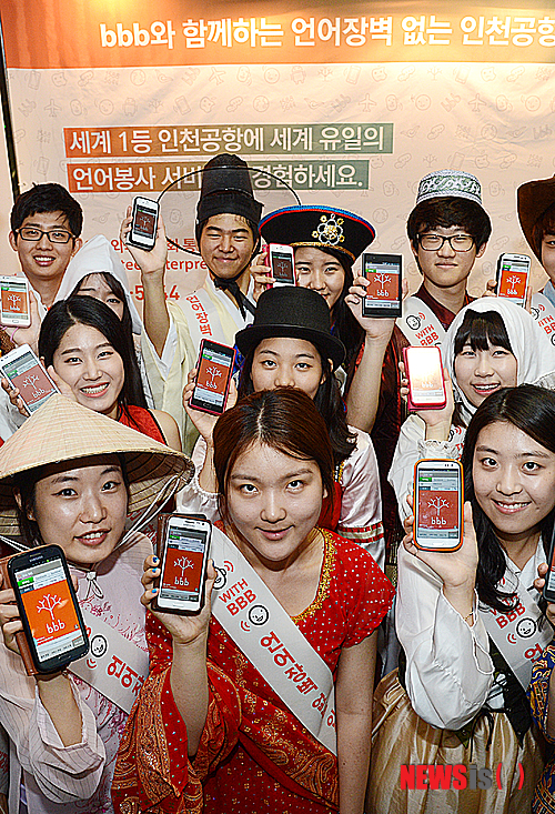【인천=뉴시스】이종철 기자 = 언어·문화 NGO BBB 코리아(회장 유장희)는 인천국제공항과 함께 17일 공항 1층 입국장 밀레니엄 홀에서 언어장벽 없는 인천공항을 만들기 위해 ‘제4회 인천공항-BBB day' 캠페인을 진행하면서 행사의 일환으로 19개국 전통의상을 입은 봉사자들이 캠페인 어깨띠를 두르고 자신의 스마트폰으로 BBB 통역 애플리케이션을 소개하고 있다. 2013.07.17