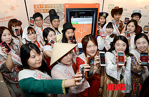 【인천=뉴시스】이종철 기자 = 언어·문화 NGO BBB 코리아(회장 유장희)는 인천국제공항과 함께 17일 공항 1층 입국장 밀레니엄 홀에서 언어장벽 없는 인천공항을 만들기 위해 ‘제4회 인천공항-BBB day' 캠페인을 진행하면서 행사의 일환으로 19개국 전통의상을 입은 봉사자들이 캠페인 어깨띠를 두르고 자신의 스마트폰으로 BBB 통역 애플리케이션을 소개하고 있다. 2013.07.17