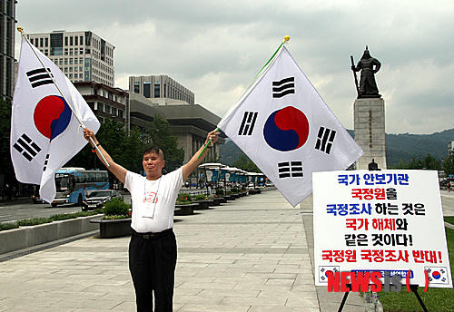 【서울=뉴시스】조성봉 기자= 나라사랑애국단체연합회 회원이 19일 오후 서울 종로구 광화문 이순신 동상 앞에서 국정원의 국정조사 거부를 촉구하는 1인 시위를 하고 있다. 2013.07.19.(사진=나라사랑애국단체연합회 제공)