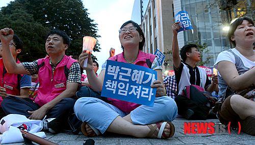 【서울=뉴시스】박상훈 기자 = 20일 오후 서울 청계광장에서 열린 '국정원대선개입 규탄, 박근혜 대통령 책임촉구 촛불대회'에서 참가 시민들이 구호를 외치고 있다. 2013.07.20.