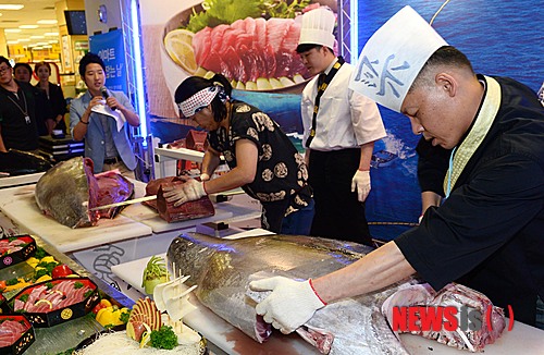 【서울=뉴시스】박주성 기자 = 25일 오전 서울 이마트 성수점에서 참치 대중화를 위해 대한민국 참치왕으로 불리는 양승호(오른쪽)씨와 일본 참치 해체 전문가인 나카가와씨, 두 한-일 참치 전문가를 초청해 고객들 앞에서 해체쇼를 하고 있다.