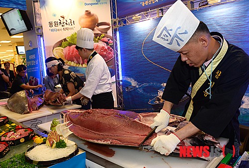 【서울=뉴시스】박주성 기자 = 25일 오전 서울 이마트 성수점에서 참치 대중화를 위해 대한민국 참치왕으로 불리는 양승호(오른쪽)씨와 일본 참치 해체 전문가인 나카가와씨, 두 한-일 참치 전문가를 초청해 고객들 앞에서 해체쇼를 하고 있다.