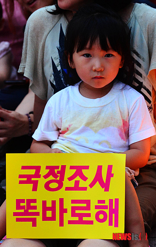 【서울=뉴시스】 박문호 기자 = 국정원 댓글의혹 사건 국회 국정조사특위가 파행을 거듭하고 있는 가운데 민주당이 비상체제 돌입을 선언하고 장외투쟁과 촛불집회 전개를 선언한 31일 오후 서울 종로구 세종로 동아일보사 앞에서 계속되는 국정원 정치개입 규탄 촛불집회에 엄마를 따라오 아이가 카메라를 응시하고 있다.