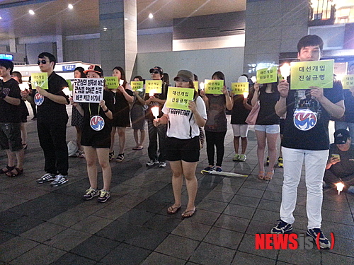 【수원=뉴시스】신상호 기자 = 인터넷 커뮤니티를 통해 모인 시민모임 NIMC(Not In My Country) 회원 등 30여명이 4일 경기 수원역 중앙광장에서 촛불집회를 열고 국정원의 대선개입에 대한 진실규명을 촉구하고 있다. 2013.08.04.
