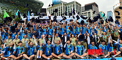 【서울=뉴시스】조종원 기자 = 5일 오후 서울시청 광장에서 한국스카우트연맹과 동아오츠카 주최로 열린 제19회 평화통일체험활동 휴전선 155마일 횡단 통일결의식에서 참가 학생들을 비롯한 관계자들이 기념촬영을 하고 있다. 2013.08.05.