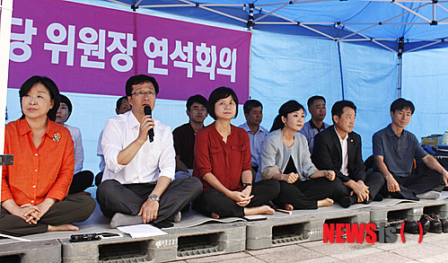 【서울=뉴시스】박문호 기자 = 정의당 천호선(왼쪽 두번째) 대표가 23일 오후 서울 중구 태평로 서울광장에 설치된 '국정원 대선개입 대통령 사과 촉구' 농성 현장에서 열린 시도당위원장연석회의에서 ‘박근혜 대통령 국정원 대선개입에 대한 사과와 국정원 개혁 등에 대한 결단’을 요구하고 있다. 2013.08.23. (사진=정의당 제공)