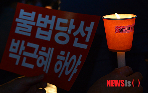 【서울=뉴시스】고승민 인턴기자 = 23일 오후 서울 종로구 청계광장에서 열린 '국정원 정치개입 규탄 9차 범국민 촛불대회'에서 참가자가 '불법당선 박근혜 하야' 피켓과 촛불을 들고 있다. 2013.08.23.