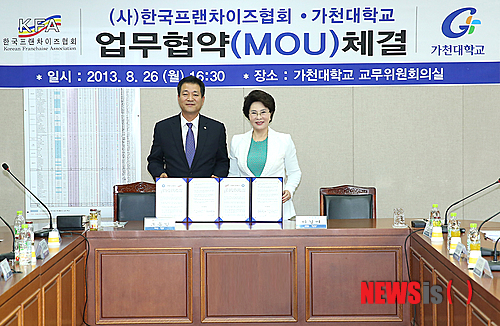 【성남=뉴시스】 이정하 기자 = 26일 경기 성남시 가천대 교무위원회의실에서 이길여 총장과 (사)한국프랜차이즈협회 조동민 회장이 '프랜차이즈산업 인력 양성'를 위한 산학협력업무협약을 체결하고 있다. 2013.08.26 (사진=가천대 제공)
