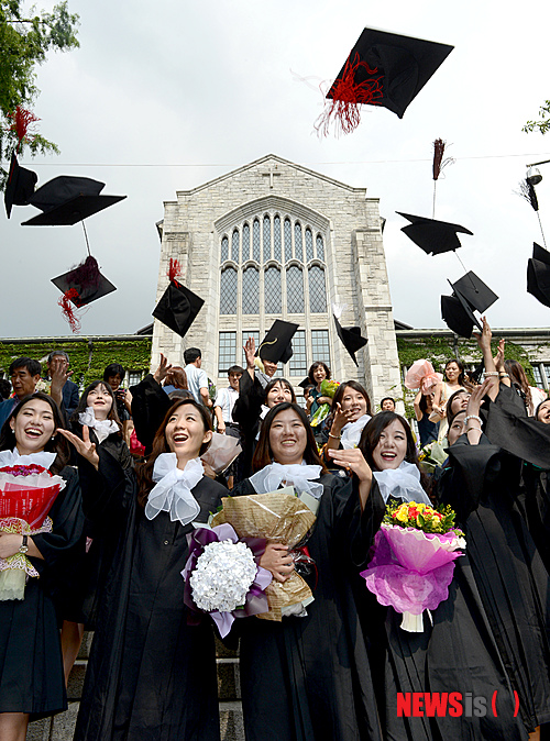 【서울=뉴시스】박상훈 기자 = 30일 오전 서울 이화여자대학교에서 열린 후기 학위수여식에서 졸업생들이 학사모를 던지며 활짝 웃고 있다. 2013.08.30.