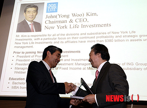 【서울=뉴시스】홍찬선 기자 = 존김 뉴욕생명투자 회장이 4일 오후 서울 성북구 안암동 고려대학교에서 열린 특강에서 이두희 고려대 경영대학장에게 감사패를 받고 있다. 존김 회장은 미국 월 스트리트에서 가장 성공한 한국인 CEO로 손꼽히고 있으며 뉴욕생명투자는 세계 최대의 무츄얼 생명보험사 뉴욕생명보험이 전액 출자한 자회사로 현재 3800억 달러에 달하는 자산을 운용하고 있다. 2013.09.04.