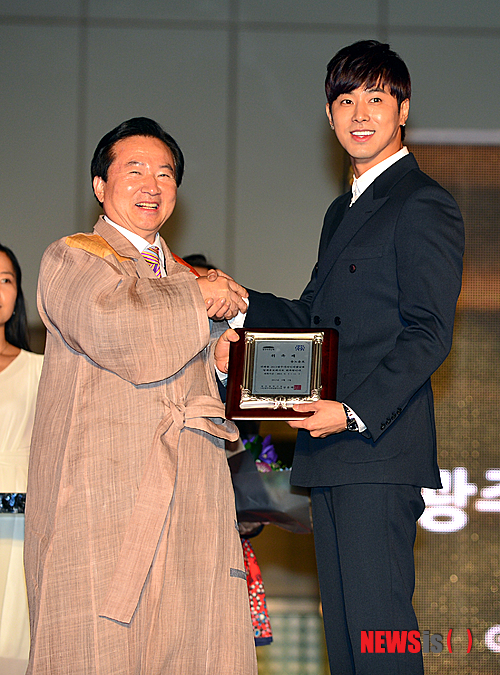 【광주=뉴시스】류형근 기자 = '거시기, 머시기'를 주제로 한 2013광주디자인비엔날레가 5일 오후 광주 북구 광주비엔날레관에서 화려하게 개막한 가운데 유노윤호가 홍보대사 위촉패를 받고 있다. 2013광주디자인비엔날레는 11월3일까지 59일동안 24개국 600여작품을 선보인다. 2013.09.05