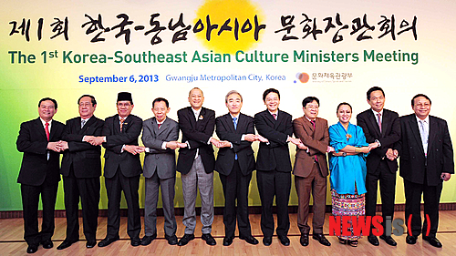 【광주=뉴시스】류형근 기자 = 6일 오전 광주 북구 광주시립미술관 특별회의실에서 제1회 한·동남아시아 문화장관 회의가 열린 가운데 각 국가의 장관들이 회의의사록을 채택한 뒤 기념사진을 찍고 있다. 2013.09.06. (사진=아시아문화중심도시추진단 제공)