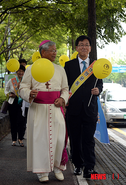 【대전=뉴시스】홍성후 기자 = 생명수호 결의대회가 11일 대전지방법원 앞에서 열려 참석한 유흥식 천주교 대전교구장을 비롯한 생명운동연합회원들이 낙태시술 의사 판결을 규탄하는 가두시위를 있다. 대전지법은 지난 6월 26일 405명의 태아를 낙태함 혐의로 기소된 의사 4명에 대한 항소심에서 선고유예와 형 면제를 선고했다. 2013.09.11.