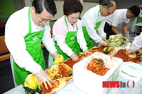 【서울=뉴시스】한국농수산식품유통공사(aT)는 11일 오후 서울 양재동 aT센터에서 다문화가족 및 사회복지시설과 함께하는‘제4회 사랑빚기 희망담기’행사를 열었다. 이날 행사에는 다문화가족, 사회복지시설 관계자와 aT임직원 등 총 210여명이 참가해 김치 3500kg와 송편 500kg을 직접 만들어 사회복지시설 20개소에 전달했다. 김재수 사장(왼쪽)과 김순자 김치 명인(한성식품 사장, 왼쪽 두번째)이 사회복지시설을 기증할 김치를 담그고 있다.2013.09.11(제공=aT)