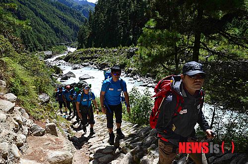 【남체(네팔)=뉴시스】임영주 특파원 = “뉴시스 창사 12주년, ‘꿈을 향한 도전’ 2013 히말라야 로체 남벽(8516m) 대한민국 원정대”홍성택 대장이 이끄는 로체남벽원정대가 카라반 둘째날인 18일(현지시각) 에베레스트와 초오유에서 발원 만나 흐르는 두두코시강을 따라 카라반을 하고 있다.