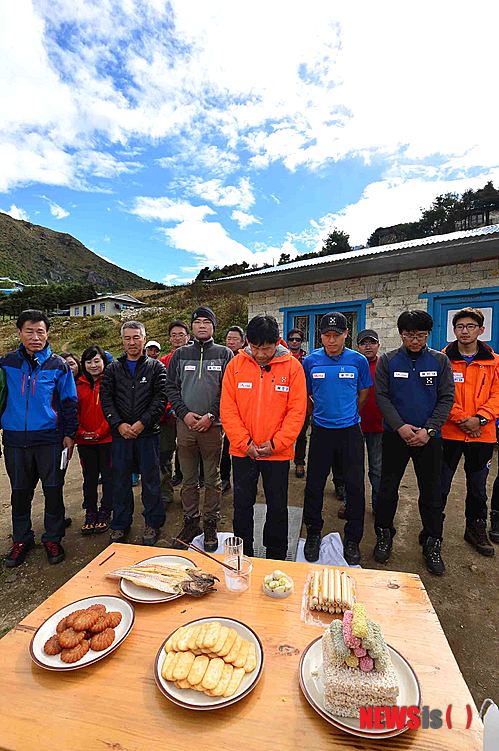 원정대는 신영철 사람과 산 편집주간의 집도로 유명을 달리한 선후배 산악인들과 조상들의 보살핌으로 안전산행과 성공을 있길 기원했고 고향의 부모형제 친척과 지인들에게 안부를 전하는 차례를 지냈다.