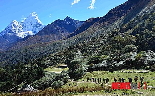 【탱보체(네팔)=뉴시스】임영주 기자 = 홍성택 대장이 이끄는 로체남벽원정대가 카라반 4일째인 20일(현지시각) 오전 히말라야 로체남벽 아마다블람과 첫 대면을 하며 탱보체를 떠나 베이스캠프를 향해 카라반을 하고 있다.