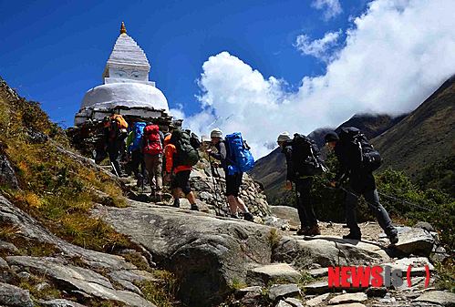 【페리체(네팔)=뉴시스】임영주 기자 = 홍성택 대장이 이끄는 로체남벽원정대가 카라반 4일째인 20일(현지시각) 오전 히말라야 로체남벽 아마다블람과 첫 대면을 하며 탱보체를 떠나 베이스캠프를 향해 카라반을 하고 있다.
