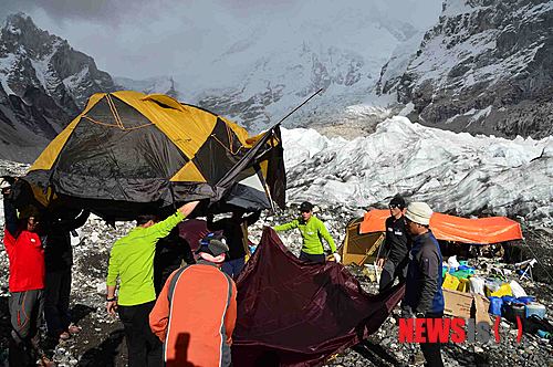 【로체 BC(네팔)=뉴시스】임영주 기자 = “뉴시스 창사 12주년, ‘꿈을 향한 도전’ 2013 히말라야 로체 남벽(8516m) 대한민국 원정대”홍성택 대장이 이끄는 로체남벽원정대가 고난의 카라반 7일만인 23일(현지시각) 오후 로체 베이스캠프(5300미터)에 입성해 텐트를 치고 있다.