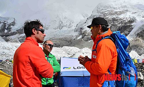 【로체 BC(네팔)=뉴시스】임영주 기자 = “뉴시스 창사 12주년, ‘꿈을 향한 도전’ 2013 히말라야 로체 남벽(8516m) 대한민국 원정대”홍성택 대장이 23일(현지시각) 오후 로체 베이스캠프(5300미터)에 도착하며 먼저 입성한 이탈리아팀과 조우하고 있다.