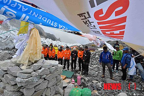 【로체 BC(네팔)=뉴시스】임영주 기자 = “뉴시스 창사 12주년, ‘꿈을 향한 도전’ 2013 히말라야 로체 남벽(8516m) 대한민국 원정대”홍성택 대장이 이끄는 로체남벽원정대가 24일(현지시각) 오전 로체 베이스캠프(5300미터)에서 대원들의 안전 기원과 성공 등반을 위한 라마제를 지내고 있다.