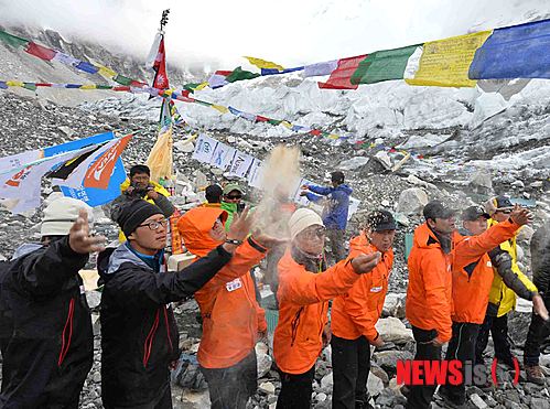 【로체 BC(네팔)=뉴시스】임영주 기자 = “뉴시스 창사 12주년, ‘꿈을 향한 도전’ 2013 히말라야 로체 남벽(8516m) 대한민국 원정대”홍성택 대장이 이끄는 로체남벽원정대가 24일(현지시각) 오전 로체 베이스캠프(5300미터)에서 대원들의 안전 기원과 성공 등반을 위한 라마제를 지내고 있다.