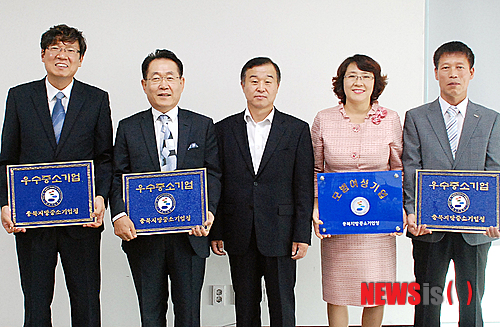 【청주=뉴시스】이병찬 기자 = 25일 충북 청원군 오창읍 충북지방중소기업청에서 열린 3분기 우수중소기업인 시상식에서 수상 기업인들이 기념촬영을 하고 있다. 사진 왼쪽부터 ㈜예원 지이규 대표, 동우신테크㈜ 김국현 대표, 이정화 충북 중기청장, 디엔에이치아이㈜ 진갑선 대표, 부강이엔에스㈜ 이석훈 전무.(사진=충북 중기청 제공)