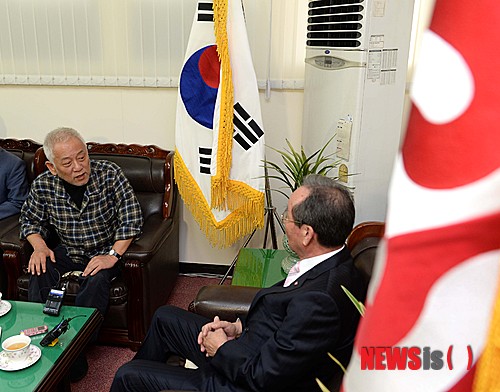 【서울=뉴시스】고범준 기자 = 김한길 민주당 대표가 26일 오후 서울 종로구 경운동 천도교 중앙총부에서 박남수 교령을 예방, 이야기를 나누고 있다. 2013.09.26.
