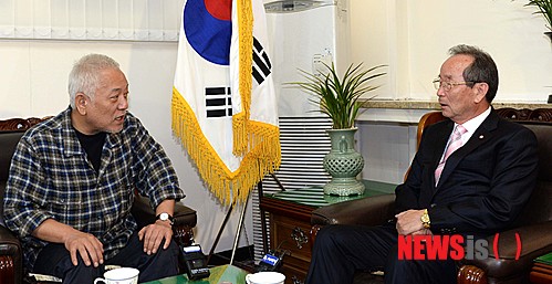 【서울=뉴시스】고범준 기자 = 김한길 민주당 대표가 26일 오후 서울 종로구 경운동 천도교 중앙총부에서 박남수 교령을 예방, 이야기를 나누고 있다. 2013.09.26.