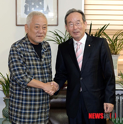 【서울=뉴시스】고범준 기자 = 김한길(왼쪽) 민주당 대표가 26일 오후 서울 종로구 경운동 천도교 중앙총부에서 박남수 교령을 예방, 악수를 나누고 있다. 2013.09.26.